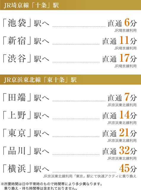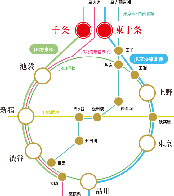 JR埼京線「十条」駅、JR京浜東北線「東十条」駅の2駅2路線が利用できます。